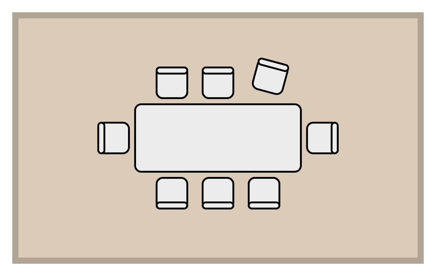 El tapete debe abarcar toda el área de la mesa y sillas, asegurando que las sillas permanezcan sobre él incluso cuando se desplacen hacia atrás al sentarse.